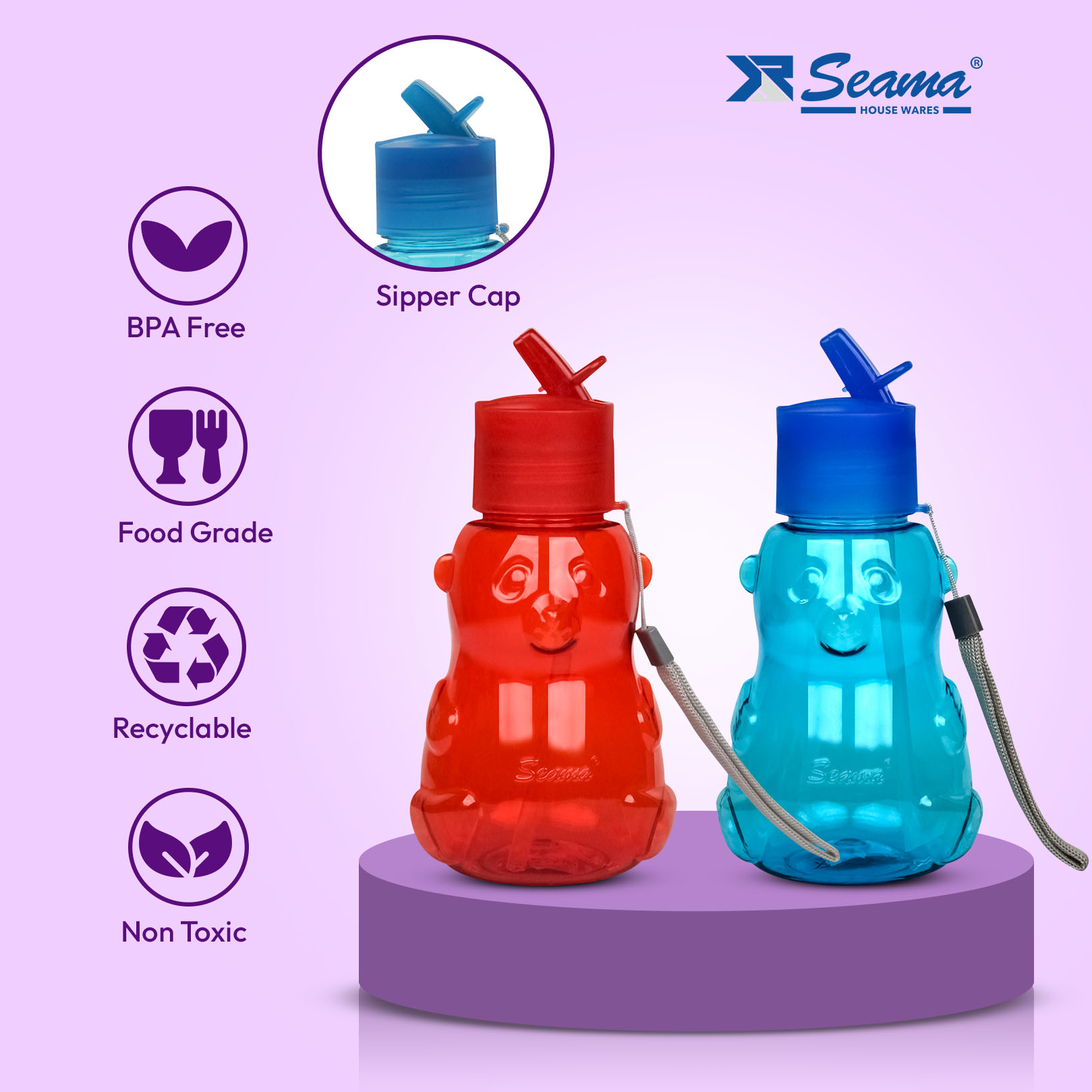 Panada Sipper Cap Kids Bottle 500ml (0.5L)- Pack of 2 | Fun, Safe, Leak-Proof Hydration Bottles for Kids
